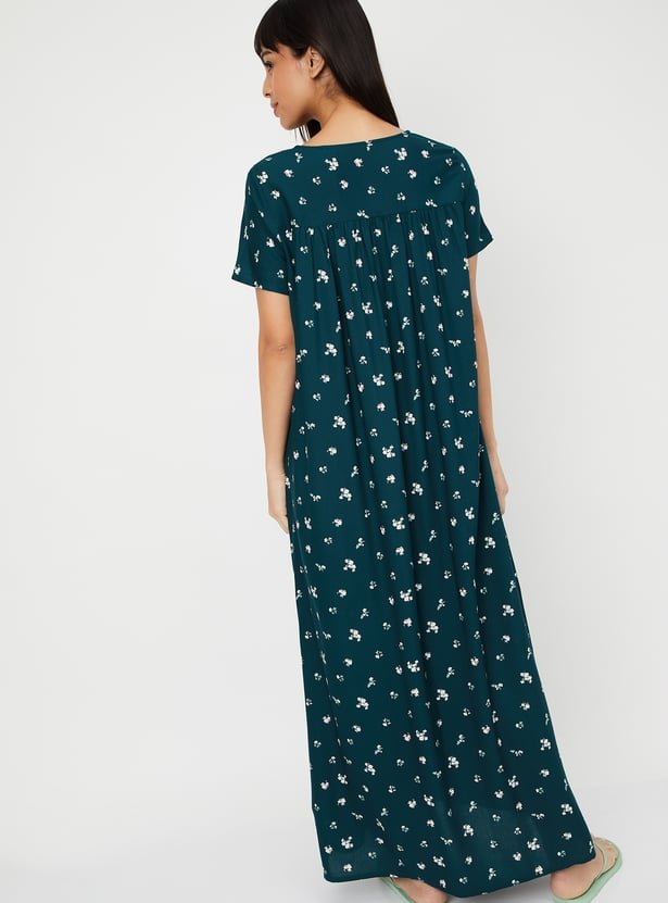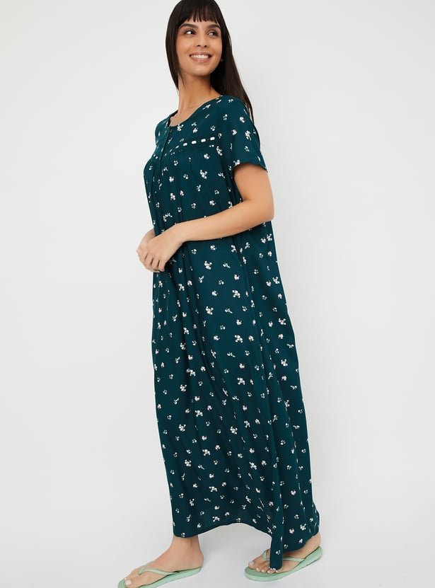Drift into comfort with this printed maxi nightgown, designed for relaxed evenings and restful nights. It features a round neck, half sleeves, and a button placket for easy wear. The flowing silhouette ensures all-night comfort.